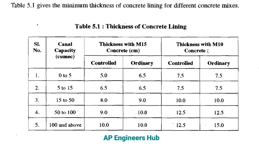 Thickness of lining is based on discharge of the canal. 50 mm is the min thickness with M15 grade.